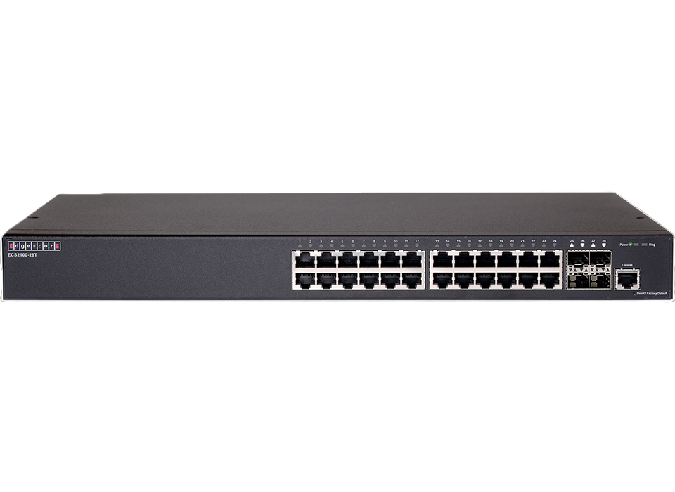 ECS2100-28T is a Web Smart Pro Switch, it supports 24 x GE ports + 4 GE SFP ports with1 RJ45 Console port and fanless design.