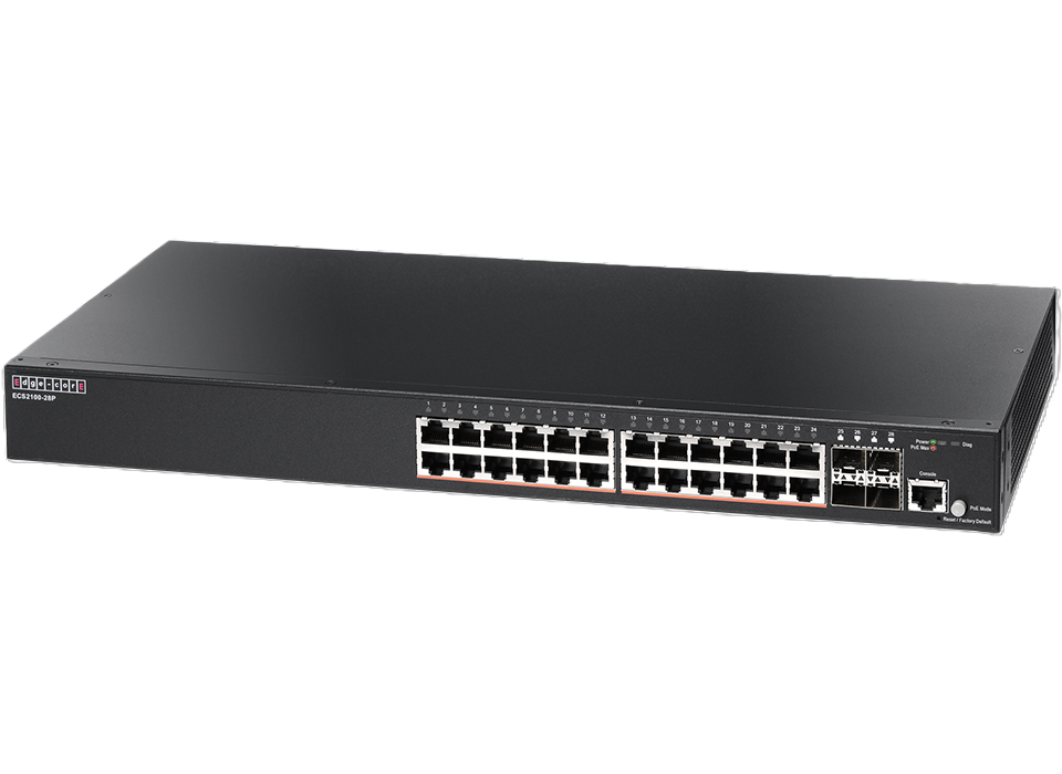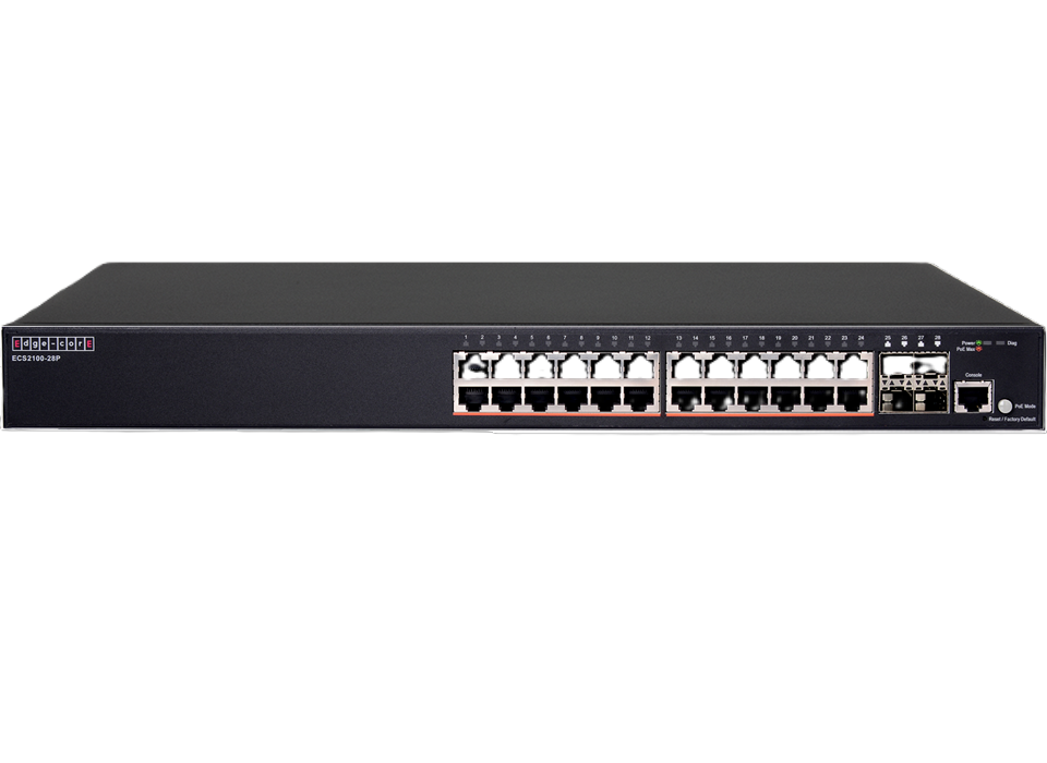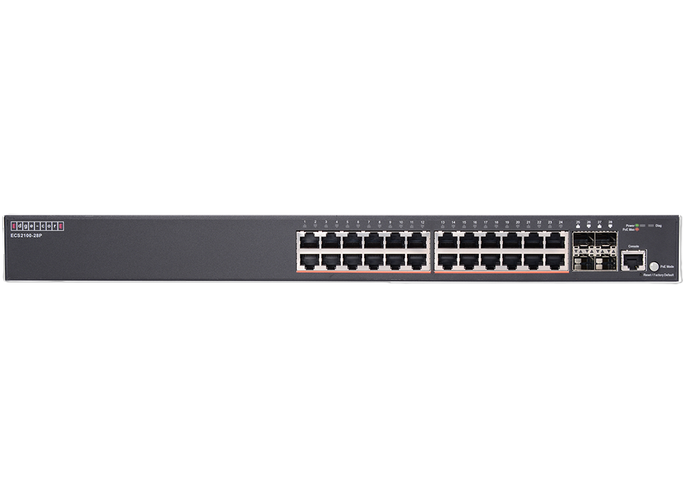 ECS2100-28P is a Web Smart Pro Switch, it supports 24 x GE PoE+ ports and 4 GE SFP ports . The PoE Budget is max.200W. ECS2100-28P provide up to 30 Watts of power to attached devices, such as VoIP phones, wireless access points, and surveillance cameras, all over existing Ethernet cables.
