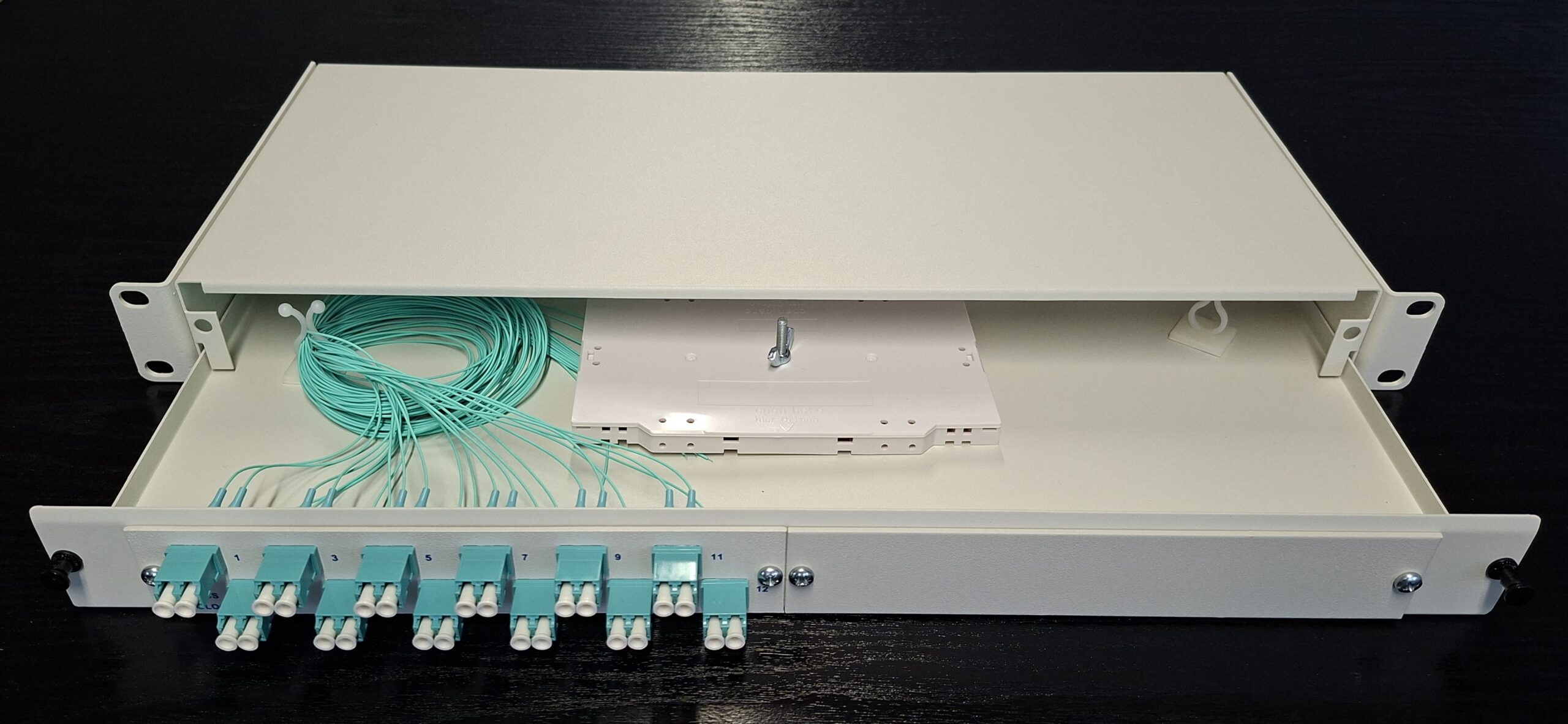 Fiber Optic Patch Panel 19″ 1U with 12 duplex adaptors LC 50/125 OM3, drawer type metal