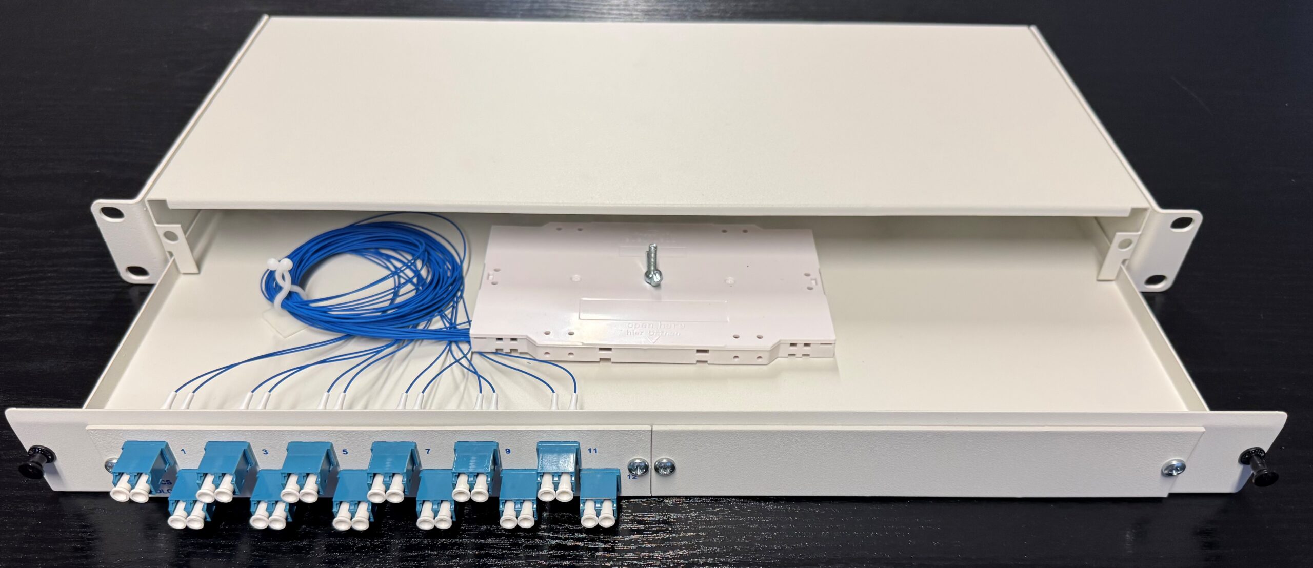 Fiber Optic Patch Panel 19″ 1U with 24 duplex adaptors LC 9/125, drawer type metal