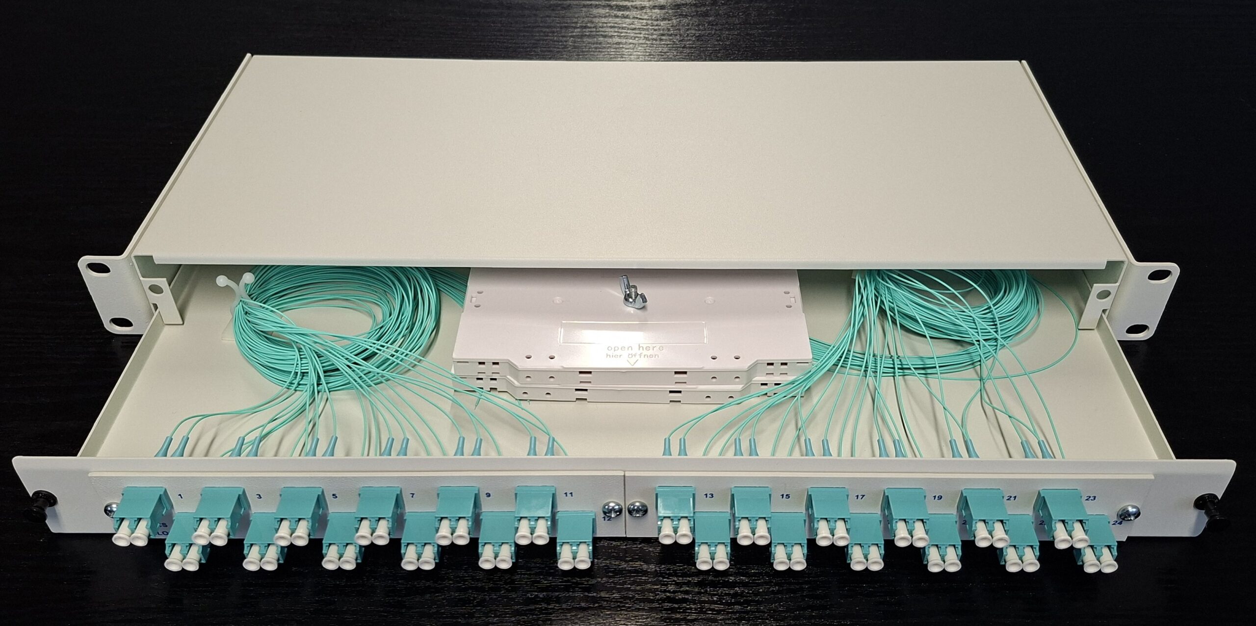 Fiber Optic Patch Panel 19″ 1U with 24 duplex adaptors LC 50/125 OM3, drawer type metal